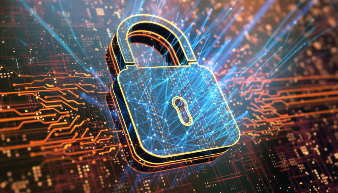 Main robotique pointant une interface de défense cybernétique quantique